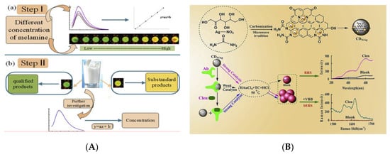 (A) Schematic of different response and the detection of Au@CQDs-based to melamine. Reproduced with permission from []. Copyright Food Chemistry, 2019; (B) Schematic of the formation of N/Ag-CQDs and the principle of the catalytic detection of Clen. Reproduced with permission from []. Copyright Talanta, 2020.