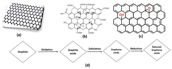 Structure of (a) graphene, (b) graphene oxide (GO), and (c) reduced GO (rGO), along with (d) the route of synthesizing rGO by reducing GO.