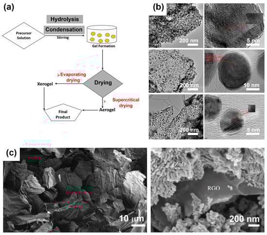 (a) Illustration of the sol–gel method, (b) transmission electron microscopy images of ZnO–GO nanocomposites (reproduced with permission from ref. [50], with permission from American Institute of Physics, 2014), and (c) scanning electron microscopy of rGO sheets (left) and rGO-ZnO core@shell structures (right) (reproduced with permission from ref. [53], with permission from Elsevier, 2020).