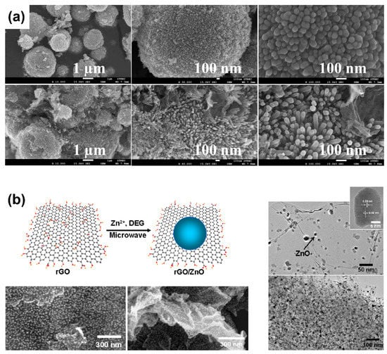 (a) Scanning electron microscopy images of ZnO microspheres (top), and ZnO microspheres-rGO composites (bottom). Adapted with permission from ref. [93], with permission from Elsevier, 2017. (b) Schematic illustration of the synthesis of rGO/ZnO nanocomposites (left), scanning electron microscopy (left) and transmission electron microscopy (right) images of rGO/ZnO nanocomposites. Adapted with permission from ref. [114], with permission from Elsevier, 2012.