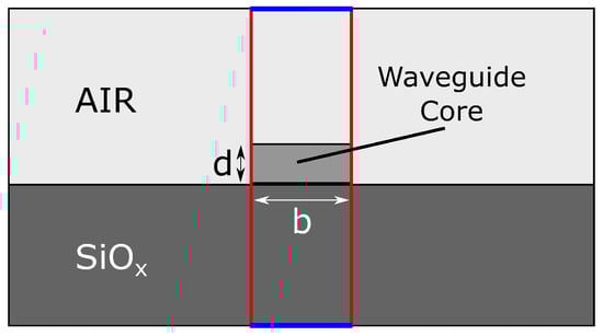 Layout of the waveguide cross-section. In case of the computation of the effective refractive index of the layer-system substrate-core-cladding, the Perfect-Magnetic-Conductor (PMC) boundary-condition is assigned to the side-boundaries of the layer-system (red), while keeping the Scattering-Boundary-Conditions (SBC) boundary-condition applied to the top and bottom borders (blue).