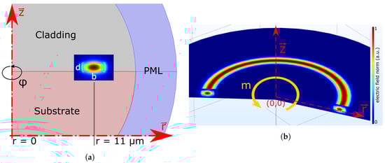 (a) Axis-symmetric model with axis of rotation at r = 0 and surrounded by a perfectly matched layer (PML)-domain. The fundamental TE-Mode is displayed in the ring waveguide b × d. (b) Resulting resonance of the axis-symmetric (AS)-model after computation, revolved around the z-axis using the azimuthal mode value m as input.