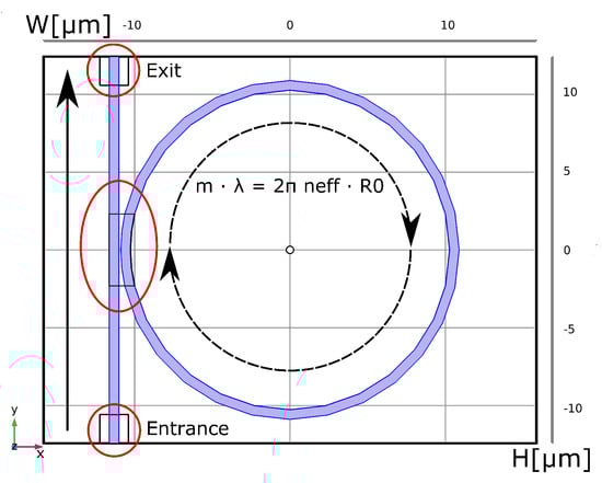 Simulations using a non-axis symmetric 2D approach can be performed for in-plane polarized light (TE) and employing an effective index. Figure 3 displays the layout of the structure. It consists of the ring and the bus waveguide which are enclosed by a computation box with dimensions W × H = . We use Scattering-Boundary-Conditions (SBC) at the external boundaries except for the entrance and exit (rectangular port conditions). The maximum element size of the mesh is set to to ensure that the mesh is fine enough to resolve the wave propagation, similar to the Nyquist-theorem []. The meshing is refined in the critical regions of entrance and exit ports and in the coupling section (red circles in Figure 3). To compute the effective index we use the waveguide cross-section shown in Figure 1 and assign Perfect-Magnetic-Conductor (PMC) boundary-conditions for the left and right boundaries (marked in red). A Frequency-Domain calculation predicts the transmission spectrum from which we extract the FSR and the resonance shift due to a temperature change. The 2D model has an advantage over the AS model if the electro-magnetic field distribution on and off resonance is of interest. Especially the coupling section and the ring radius have to be optimized to operate the ORR in ideal conditions (critical coupling, single mode, FSR []).
