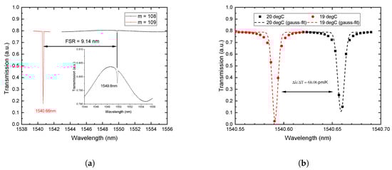 with m being the azimuthal mode number, the resonance wavelength, effective index, and the ring radius measured from the center of the ring to the center of the waveguide. The temperature shift of the resonance wavelength is given by the following equation, as derived by Xu []: