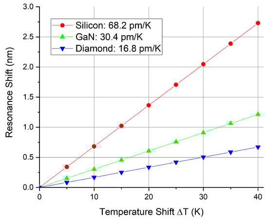 Figure 6 shows the computed wavelength shifts of the resonance close to 1550 nm () depending on the ambient temperature for the investigated materials. Owing to its high thermo-optic coefficient, Si shows the highest temperature-sensitivity with an estimated shift of 68.2 pm K−1, followed by GaN with 30.4 pm K−1 and diamond with 16.8 pm K−1. As expected, the estimated temperature sensitivities follow the ratios between the thermo-optic coefficients. This indicates that the thermo-optic coefficient is the main contributor to the sensitivity. For the observed wavelength and temperature range (0–40 ) the thermo-optic coefficient can be considered linear. However, for larger temperature ranges it varies with temperature and decreases in general with lower temperatures (e.g., see [] for the case of Si). In the this analysis the thermal expansion of the devices is neglected. For silicon this plays a minor role, however, the influence of thermal expansion on GaN and diamond is higher due to the smaller difference between the thermo-optic coefficient and the thermal expansion coefficient (Table 2). Since both coefficients lead to a resonance shift towards higher wavelengths with increasing temperature, the temperature sensitivity of GaN and diamond would be correspondingly higher. In addition to that, diamond has a high thermal conductivity, low thermal expansion and a wide bandgap [,], which predestines this material for opto-mechanical measurements.