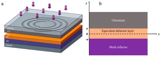As a metal heterostructure, the MIM waveguide can restrict the optical field energy through different absorption characteristics of each layer so that the focusing effect on the corresponding sub-wavelength scale can be investigated. By constructing the MIM waveguide in the etched structure, the appearance of the radiation mode and the leakage mode can be avoided. Consequently, the energy flux density of SPPs in the photoresist can be improved. Figure 2a illustrates the diagram of the MIM heterostructure in the RNFP system. Investigations indicated that chromium has remarkable mechanical strength and chemical stability, which can be utilized to process the plasmonic lens to excite SPPs under 355 nm illumination [27]. Therefore, a chromium layer with 60 nm thickness is used at the photolithography head for the RNFP system. The findings show that the equivalent medium method can be applied to equalize the air and the photoresist layers. The aluminum film is regarded as the metal reflector. Therefore, chromium-equivalent dielectric layer-aluminum constitutes the basic MIM waveguide. Compensating the intensity attenuation of the vertical field with the metal reflector is an effective method to improve the steepness and resolution of the development pattern, based on the principle of MIM waveguide. However, the dielectric constant of the metal reflector significantly affects the propagation characteristics of SPPs, resulting in different distributions of the energy flux density in the photoresist layer. In light of this, the material selection of the metal substrate is the key factor to determine the internal energy intensity of the photoresist layer. In order to facilitate the theoretical analyses, the equivalent transformation is carried out to transform the model shown in Figure 2a to that in Figure 2b. The origin point and the x-axis represent the center of the equivalent dielectric layer and the horizontal direction of the interface, respectively. Moreover, the distance between “−a” to “a” represents the total vertical length of the equivalent dielectric layer. Figure 2b indicates that the chromium layer and the metal reflective layer are located beyond “a” and behind “−a” of the y-axis, respectively.