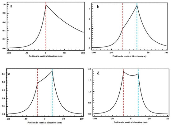 The longitudinal coordinate in Figure 3 represents the dimensionless magnetic field components, while the abscissa represents the position variation in each vertical direction, which was previously illustrated as the y-axis in Figure 2b. The red dotted line is the interface between the chromium (the left part) and the equivalent layer (the right part), where SPPs are excited. Moreover, the blue dotted line is the interface between the equivalent layer (the left side) and the metal reflector (the right side). The equivalent dielectric layer between the two dotted lines is the developing layer, which is the main observation section of the energy distribution. Figure 3a shows the distribution of Hy when there is no metal reflector. It can be observed that the field intensity of SPPs excited by the interface of the chromium-equivalent layer decreases rapidly as the distance between the chromium film and the photoresist increases. When the light beam energy approaches the SPPs excitation level, it can reach the exposure threshold of the photoresist. Then the energy continues to decay rapidly after reaching the photoresist interface, which is very harmful to the linewidth, depth, and the steepness of the RNFP system. Figure 3b,c illustrate the silver and chromium reflective layers, respectively. The findings show that adding the metal reflector remarkably improves the energy distribution of SPPs in the developing layer. Furthermore, Figure 3b,c indicate that the energy flux distribution at the interface between the equivalent layer and the reflective layer is the highest, which greatly improves the energy distribution in the photoresist layer, and simultaneously improves the development depth. However, it is observed that the energy distribution in the equivalent dielectric layer is inconsistent with the two interfaces, which adversely affects the linewidth resolution and the steepness of the processed graphics. When the aluminum reflector is utilized, the energy distribution at the two interfaces slightly changes. Figure 3d shows that the SPPs reflected by the aluminum film are reasonably coupled with the SPPs excited by the chromium-air interface. The uniform distribution of the field intensity of SPPs in the photoresist layer improves the depth and the steepness of the near-field lithography, and it ensures high resolution and consistency of the processing linewidth. Considering all foregoing factors, the aluminum reflector is the preferred reflector in the RNFP system.