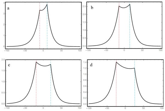 Since , , and are constants in each layer, the distribution of Hy determines the distribution of the Poynting vector in each layer so that the y-direction can also be characterized in the z-direction. Since ultraviolet light with a wavelength of 355 nm is used as the illuminant, the precious metals, including chromium, aluminum, and silver, should be selected to excite SPPs. In this wave band, the dielectric constants of chromium, aluminum, silver, air, and photoresist are , , , 1 and 2.455, respectively [38]. In the MIM model, the dielectric constant of the equivalent dielectric layer, which is composed of the photoresist and air, is equivalent to the following expression: , where the calculated value is 2.091. In order to determine the correlation between wave vectors and , known parameters should be introduced into the wave Equation (12). Then parameter can be calculated from (13) so that can be obtained [20,39] when the thickness of the air and photoresist layers are 10 and 30 nm, respectively. In this case, the parameter “a” in Figure 2b is assumed to be 20 nm.