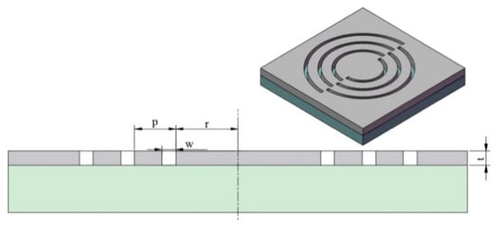 In Figure 5, p, r and w are the groove pitch, the width of the first ring, and the groove width, respectively. Moreover, t and nu denote the chromium layer thickness and the groove number, respectively. It should be noted that the optimization methods of each parameter are discussed in detail in reference [16].