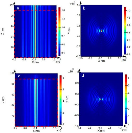 Figure 6 shows the obtained results, which were verified through the FDTD Solutions software. Figure 6a illustrates the energy distribution of SPPs focusing effect, while no metallic reflector is installed. It presents the photoresist layer within the red dotted line frame (70–100 nm), while the quartz substrate is located beyond 100 nm. Figure 6b shows the cross-section of the spot at 85 nm. Figure 6c shows the energy distribution of SPPs for the most used metal reflectors on aluminum substrates. Similarly, the photoresist layer is located within the red dotted line frame (70–100 nm), while the metal reflector layer is located beyond 100 nm. Figure 6d shows the cross-section of the spot at 85 nm, which is much smaller than that of Figure 6b. Moreover, Figure 6a indicates that the focusing energy of the exit layer (100 nm) is lower than that of the entrance layer (70 nm). Furthermore, it is found that the maximum field enhancement factor and the diameter of the focusing spot are 1.7 and 50 nm, respectively. A comparison of Figure 6a,c indicates that the application of aluminum reflector not only reduces the energy attenuation of SPPs at the interface of the photoresist entry but it also effectively improves the field enhancement factor of SPPs in the photoresist layer. Figure 6b,d show that the optimal full width at half maximum (FWHM) can reach 25 nm indicating that the MIM waveguide structure can substantially reduce the beam spot diameter. Moreover, Figure 3 and Figure 6 indicate that the aluminum reflector increases the energy distribution of SPPs in the equivalent dielectric layer, thereby reducing the beam spot diameter. Similar values of the energy entering and leaving the photoresist interface demonstrate that the structure is beneficial for improving the steepness of the near-field photolithography system. The obtained simulation results are consistent with the theoretical analysis results.