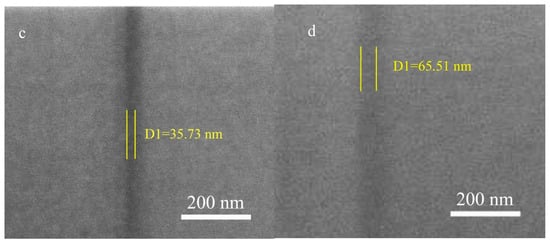 The loading mode of the flight transition zone is utilized to ensure the stable flight of the etching head of the plasmonic lens on the photoresist surface [13,40]. Figure 8 shows the obtained development results from the SEM scanning with 50 mW laser irradiation. It should be noted that the FIB/SEM/GIS integrated mode dual-beam focused ion beam system of TESCAN Company is applied for the SEM photography. Prior to the scanning, a platinum film with a thickness of 1 nm is deposited on the photoresist surface. Moreover, the corresponding beam current is set to 15 kV. The magnification factor is 200,000 times. Figure 8a shows the development linewidth is less than 20 nm for the aluminum reflector. It is worth noting that the same processing methods as those of Figure 8a are applied to interpret Figure 8b. However, the aluminum film thickness is slightly different in these two figures. This difference originates from the difference in the sputtering time. Similar linewidths indicate that the development results are robust to the thickness change of the aluminum film. Moreover, Figure 8c shows the development result for the chromium reflector. The wider linewidth in Figure 8c than those of Figure 8a,b indicates that the reflection property of the chromium is weaker than that of the aluminum reflector. These development results are consistent with the simulation results observed in Figure 3. The brilliant linearity roughness also proves the effectiveness of the energy coupling of metal reflectors. Comparing the results obtained with those of the 65.51 nm linewidth using the non-metallic reflector (Figure 8d) indicates the important role of the energy density optimization in the developed photoresist. The development results show that the processing system has reasonable robustness to the etching structure, ensuring the suitability of the RNFP system in industrial applications.