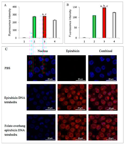 Targeted capture of folate-overhung DNA tetrahedra by leukemic cells and their co-localization into nuclei, by transport across the nuclei membrane. Epirubicin was used as a fluorescent probe for indicating folate-overhung epirubicin DNA tetrahedra. (A). Cellular uptake by BALL-1 cells indicated with the fluorescence intensity; (B). Cellular uptake by K562 cells indicated with the fluorescence intensity. For (A,B): 1. PBS; 2. Epirubicin DNA tetrahedra; 3. Folate-overhung epirubicin DNA tetrahedra; 4. Folate-overhung epirubicin DNA tetrahedra after saturation with excess of folate. a. vs. PBS; b. vs. epirubicin DNA tetrahedra; c. vs. folate-overhung epirubicin DNA tetrahedra after folate saturation. p < 0.05 (C). The co-localization of drug with nuclei of leukemia K562 cells.
