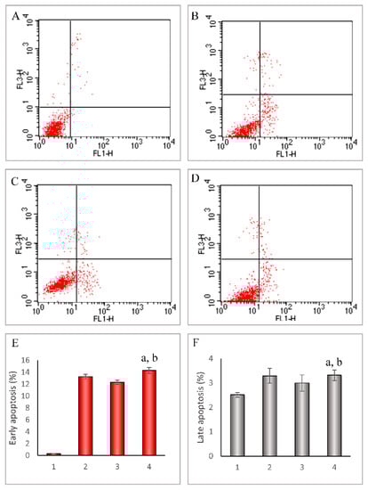 Induced apoptosis in leukemia BALL-1 cells by folate-overhung mitoxantrone DNA tetrahedra. (A–D): Induced apoptosis after treatment with varying formulations at 10 h, and the cells were stained using Annexin V-Fluor 647 and 7AAD, then assessed according to manufacturer instructions by the FACScan flow cytometer. UR: Late apoptosis and dead cells; LR: Early apoptosis cells (A). PBS; (B). Free mitoxantrone; (C). mitoxantrone DNA tetrahedra; (D). Folate-overhung mitoxantrone DNA tetrahedra; (E). The early apoptosis rate in BALL-1 cells (F). The late apoptosis rate in BALL-1 cells. (E–F): 1. PBS; 2. Free mitoxantrone; 3. Mitoxantrone DNA tetrahedra; 4. Folate-overhung mitoxantrone DNA tetrahedra. a. vs. PBS; b. vs. mitoxantrone DNA tetrahedra, p < 0.05.