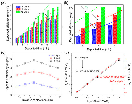 A successful EPD generally largely depends on various dispersing agents, and a large number of experimental studies have been carried out to compare the dispersion systems for EPD of specific sorts of particles [24,30,31]. After a large number of comparison attempts, the optimal dispersing agent of mixture of isopropanol, polyethyleneimine, and benzoic acid was used to fabricate the nano-Al/MoO3 MIC by EPD at normal tempearture and pressure. For verifying the EPD controllability, dynamic behaviours of particles in optimized suspension were studied in detail. Shown in Figure 2a is the deposited efficiency (mg/cm2) as a function of deposited time under applied electric field strengths ranging from 6 to 12 V/mm during EPD of Al/MoO3 MIC films. It was obviously observed that the deposition efficiency increased with the EPD time when the field strength was fixed at 6 V/mm, and a similar trend was also seen in a higher field strength of 9 or 12 V/mm. The higher field strength provides a higher EPD efficiency at a certain deposited time (e.g., 10 min). Moreover, the deposited efficiency increased linearly with deposited time increasing from 0 to Tc (the critical time between linear and non-linear EPD dynamic in the critical region (black circle)) in Figure 2a,b, which is consistent with the research of the Zhang group [32]. In addition, Tc decreased with an increase of applied field strength; that is, Tc for 6 V/mm was larger than Tc for 9 and 12 V/mm, which was primarily due to the more severe precipitation and collision of particles under higher field strengths. Thus, the EPD process of Al/MoO3 MIC can be more precisely controlled in the linear control region (t < Tc) in this study, which is due to the relatively complex relationship of deposited efficiency and EPD time in the nonlinear variation region for all field strengths. Furthermore, the effect of the distance of electrodes on the deposited efficiency of the nano-Al/MoO3 MIC is analyzed in Figure 2c. When the solid loading concentration, EPD time, and applied field strength were set at 0.5 g/L, 8 min, and 12 V (blue line), respectively, the deposited efficiency increased gradually with the distance of electrodes rising to 1.2 from 0.4 cm. It then decreased slowly, as the distance of electrodes continued to increase. This result is perhaps caused by the more violent disturbance of particles under a smaller distance of electrodes, and the higher degree of the settlement of particles under a longer distance of electrodes that leads to a lower EPD efficiency. Similar change trends were observed at higher field strengths (Figure 2c), which provides a valuable reference for realizing controllable EPD of different particles.
