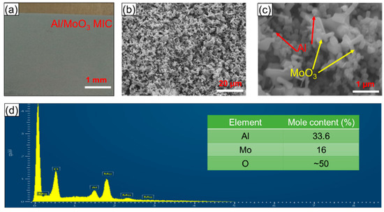 The as-obtained nano-Al/MoO3 MIC films via EPD are displayed in Figure 4. Regions of large-scale local sags, crests, and separations are not seen optically in the target product surface (Figure 4a), which exhibits significant coating characteristics and uniformity. Clearly, in the FESEM image of product in Figure 4b, the nano-Al/MoO3 MIC appears to be uniformly distributed, without rare unmixed zones. The higher-resolution images in Figure 4c indicate that the nano-Al particles were scattered or distributed randomly in flake-like MoO3, which significantly helps to enlarge the contact areas of Al and MoO3, and shorten the mass transportation length (MSL) during the thermite exothermic reaction of nano-Al/MoO3 MIC. Moreover, there were numerous gaps among the particles (Figure 4b,c), contributing to providing a large number of heat-release channels or multiple spatial streams, and further improving the exothermic performance of the product [27]. Moreover, the elemental compositions in the nano-Al/MoO3 MIC were analyzed by the EDX technique, as shown in Figure 4d, where the EDX spectrum indicates that all expected elements of Al, Mo, and O existed in the energetic film surface, consistent with the results of the XRD analysis. It is worth noting that the mole ratio of Al, Mo, and O was close to 2:1:3 (0.336:0.16:0.50) (seen in Figure 4d and Table S1 in Supporting Information), and the corresponding reaction mole ratio of Al and MoO3 was close to 2:1, which contributed to realizing a sufficient aluminothermic reaction (2Al + MoO3 → Al2O3 + Mo + HHeat−release, ΔH = 4698 J/g) [17,33]. In addition, we conducted a comparative study of FESEM mapping and the corresponding results are similar in three random regions (Table S1), where the mole ratio of aluminum to nickel is close to 1:1, which indicates the uniform distribution of the product. Moreover, the percentage errors of the mole ratio of elements are approximate 5% in six random regions, according to both EDX and AAS analysis, further demonstrating the homogeneously mixed nano-Al/MoO3 MIC obtained by EPD.