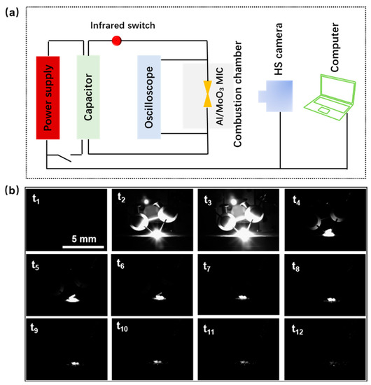 (a) Schematic of the ignition system for the micro nano-Al/MoO3 MIC chip initiator, and ignition process recorded by a high-speed camera; (b) series of still images taken from a typical ignition deflagration study of the nano-Al/MoO3 MIC fabricated by EPD process with Φd = 1.0; the time interval between images is 0.1 ms (tn − tn−1 = 0.1 ms, n ≥ 2).