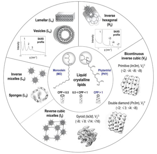 Structures of commonly encountered mesophases produced by the self-assembly of lyotropic lipids with varying critical packing parameters (CPP). The liquid crystalline phases are identified based on their characteristic diffraction spacing ratios determined by the small-angle X-ray scattering (SAXS) technique (reproduced from [7], with permission from Wiley-VCH Verlag GmbH & Co., 2020).