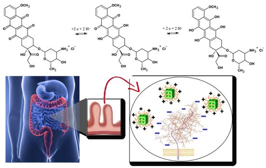 Chemical structures and redox process of the anticancer drug doxorubicin, from left to right: initial, oxidized and reduced forms of doxorubicin (top panel). Scheme of oral drug administration indicating the microvilli of the intestinal membrane, for which bioadhesive positively charged cubosome particles (modified by polyelectrolyte shells) interact with the negative charges of the mucin layer over the mucosal membrane (bottom panel). Either the biocompatible polyelectrolyte shells or the lipids, constituting the cubosome nanocarriers, are pH-sensitive.