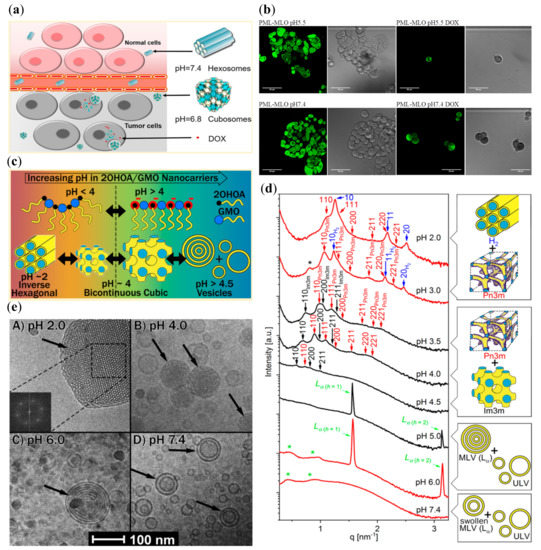 Li et al. [59] used an increasing content of oleic acid to produce pH-sensitive cubosomes loaded with the anticancer drugs doxorubicin and Brucea javanica oil (BJO). The latter involves unsaturated fatty acids, the protonation/deprotonation equilibrium of which is pH-dependent and therefore advantageous for the fabrication of pH-responsive nanomedicines (Figure 3a). Using monoolein as the lipid matrix in conjunction with oleic acid, Brucea javanica oil served as a payload and Pluronic F127 as a stabilizer of the nanoformulations. The components were mixed by heating to 60 °C and a PBS buffer containing dissolved doxorubicin hydrochloride was subsequently added. Homogenization under high pressure was performed after intensive stirring in order to obtain dispersed dual-drug loaded nanoparticles (Table 1). The nanocarriers undergo a clear pH-induced structural switch of their inner liquid crystalline organizations [59]. Hexosomes with an inner hexagonal HII phase structure were identified by SAXS at pH 7.4, whereas cubosomes with coexisting Pn3m/Im3m inner cubic structures formed at pH 6.8 and below. SAXS experiments established a transition of the inner crystalline organization to emulsified microemulsion at pH 5.3, which is related to changes in the interfacial hydration state of the lipid bilayers in the presence of oleic acid under acidic conditions. The higher concentrations of encapsulated Brucea javanica oil increased the fluidity and thus hampered the ordering of the lipid bilayers into a crystalline cubic lattice membrane (cubosome nanocarriers). In addition, the produced dual-drug loaded nanoparticles showed a shift to a decreased ordering of the internal structure at pH 7.4 upon loading of doxorubicin, while keeping the pH-responsive effect. The pH-induced phase change from an inverted hexagonal to a cubic network, and to a less ordered emulsified microemulsion phase, could be correlated with the sustained drug release properties of the nanoparticles. Moreover, in vitro studies of cytotoxicity and apoptosis with the human MCF-7 carcinoma cells demonstrated an enhanced antitumor activity, which was discussed in view of the pH-responsive properties of the cubosome particles (Figure 3a).