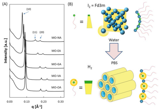 (A) SAXS patterns of monoolein (MO)-fatty acid nanoparticles exhibiting a hexagonal HII symmetry in buffer medium (PBS, pH 7.4) at 30 °C. (B) Schematic presentation of the effect of pH on the ionization state of the unsaturated fatty acid and the interfacial curvature leading to a transformation of the micellar cubic Fd3m phase into an inverted hexagonal HII phase when water is replaced by PBS (reproduced from [70], with permission from Elsevier, 2020).