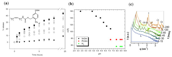 Another cubic phase, functionalized by a specially designed lipid, was investigated by Rahanyan-Kägi et al. [71]. The monoolein cubic phase was doped with 1 wt % of a novel synthetic “Lipid 3” containing a p-nitro benzoic acid head group (Figure 5a, inset) with pKa around 3.6. The incorporation of “Lipid 3” rendered the cubic Pn3m liquid crystalline phase pH-sensitive. The release of encapsulated hydrophilic cationic compound MG (methylene green zinc chloride double salt) was monitored as a function of various pH conditions. The deprotonation of the carboxylate head group of the guest lipid at pH 7 resulted in binding with the positively charged MG, in contrast to the pure monoolein lipid phase, in which the head groups are neutral. Upon the decrease of the pH to 5, 3 and 2.5, the carboxylate head group of “Lipid 3” was progressively protonated. This led to losing the charged character, and thus to decreased binding between MG and “Lipid 3”. As a result, an increased MG release from the cubic phase over 40% was attained after 24 h, whereas the release was around 20% from the pure monoolein system (Figure 5a). The study showed the potential of the liquid crystalline structures containing the synthetic “Lipid 3” as a platform for the development of drug delivery nanomaterials with pH-controlled release properties.
