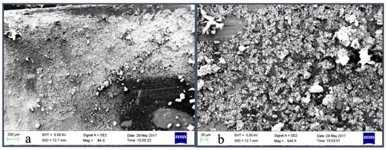 The surface morphology of Mn:ZnS QDs samples was also studied using scanning electron microscopy (SEM). Figure 2 depicts the SEM images of the prepared nanocrystalline samples. The micrographs show that the synthesis method generates crystalline agglomerated nanoparticles of ZnS. The morphology reveals that as-synthesised Mn:ZnS QDs clusters are formed by prime building units of diverse orientations. Also there is a random aggregation between small particles, which leads to the development of irregular-shaped crystallites [43]. At lower magnification (Figure 2a) the micrograph shows un-homogeneities regarding particle size distribution. The higher magnification image (Figure 2b) clearly reveals that large particles are, in fact, agglomerates of the smaller sized particles.