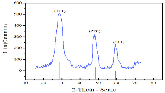 The XRD diffractogram depicted in Figure 3 shows that as prepared Mn:ZnS nanoparticles are crystalline and pure. The nanocrystals have less lattice planes than the bulk, which causes broadening of the peaks attributed to small particle effect [44]. Pure zinc blended crystal structure with the three broad peaks corresponding to the (111), (220) and (311) planes with reflections at 2θ = 28.4°, 48.3°, and 59.3° are observed. These results are in conformity with other experimental studies [45,46,47].