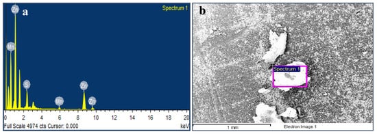 The energy dispersive X-ray analysis (EDS) revealed the elemental composition of the samples. Figure 4a shows the EDS of the average grains of Mn:ZnS QDs sample (Figure 4b). The analysis revealed the presence of 83.92 wt.% Zn, 13.32 wt.% S, and 2.77 wt.% Mn in the samples. Zn is present at 1.1, 8.7, and 9.6 keV, Mn at 0.5 and 6 keV, and S is present at 2.4 keV in the Figure 4b. Some more peaks are visible at 0.3, 1.6, and 3.1 keV, which are artificially (the so-called escape peaks) developed when the X-rays produced by fluorescence escapes the detector during analysis, as referred by the instrument supplier.