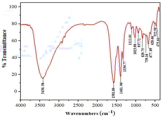 The FTIR spectrum of Mn:ZnS QDs is shown in Figure 5. There are various features in the range of 500–4000 cm−1 associated with different functional groups [48,49]. The broad band at 3430 cm−1 is due to primary amine, N–H stretching. The bands at 2840 and 2930 cm−1 are due to a weak C–H stretching band. In the spectrum, the region between 1600–1300 cm−1 generally reveals the ring stretching vibrations. The absorption involves stretching and contraction of all the bonds in the ring and interaction between these stretching modes. Thus, the strong absorption peaks between 1401 cm−1 and 1581 cm−1 are due to aromatic C=C and C=N stretch in the ring. Bands corresponding to 1339 cm−1 indicate the presence of –CH2 group. The peaks between 730–830 cm−1 are ascribed to C–H deforming vibration. Some other small peaks are also present in the spectrum, however not discussed here. Thus, the FTIR study strongly supports the formation of CPC capped Mn:ZnS QDs.