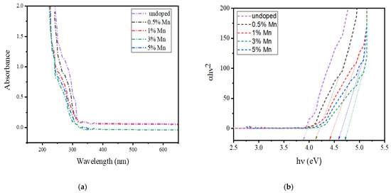 Figure 7a shows the ultraviolet-visible (UV-vis) spectra of pure ZnS and Mn:ZnS QDs. The absorption band of the QDs can be found between 250 to 290 nm, but in case of bulk ZnS, the band is observed near 350 nm with an energy-gap of 3.68 eV [51]. Figure 7b shows the band gap energy curve of pure ZnS and Mn:ZnS QDs calculated from the Tauc’s relation [52]. The direct optical energy gap value (Eg) obtained for pure ZnS is 3.88 and for Mn doped ZnS QDs it is found to be 4.12, 4.39, 4.6, and 4.5 for 0.5%, 1%, 3%, and 5%Mn doping. The observed increase in Eg value, as well as the blue shift of the absorption spectra, might be caused by the decline in the size of the particles, due to the quantum size confinement [53,54]. A slight decrease in the Eg value is found above 3% Mn doping which indicates that the particle size increases with a further increase in Mn concentration [55].