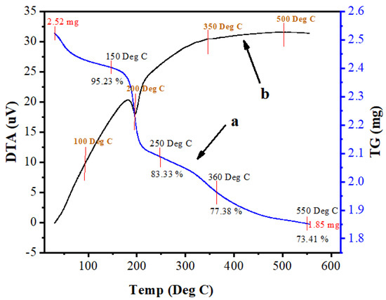 The thermal decomposition, stability and temperature of phase formation study of Mn:ZnS QDs was carried out by thermal analyses. Differential thermal analysis (DTA) and thermogravimetric analysis (TGA) were conducted to evaluate the thermal behaviour of the complexes. Data was collected from room temperature up to 700 °C, with a heating rate of 10 °C/min. Figure 8a,b shows the TGA and DTA curves of Mn:ZnS QDs. The endothermic peak near 200 °C is due to the loss of physically adsorbed water. In the TGA plot, various stages of weight loss are observed. The first weight loss up to 250 °C (16.67%) is related to physically adsorbed water molecules. The second weight loss (5.95%), between 260 and 360 °C, is associated with the degradation of organic groups coming from the precursor particles. The third (3.97%) deals with the release of Mn ions, as well as decomposition of residual S ions from the sample. Curve A shows that the analysis started with 2.52 mg sample weight, and after heating to 600 °C, the sample weight was 1.85 mg. Thus, the weight loss percentage up to 700 °C was 26.5%. The DTA curve at Figure 8b shows an exothermic process up to 460 °C, which might be due to a change in crystallinity or a phase change in the material.