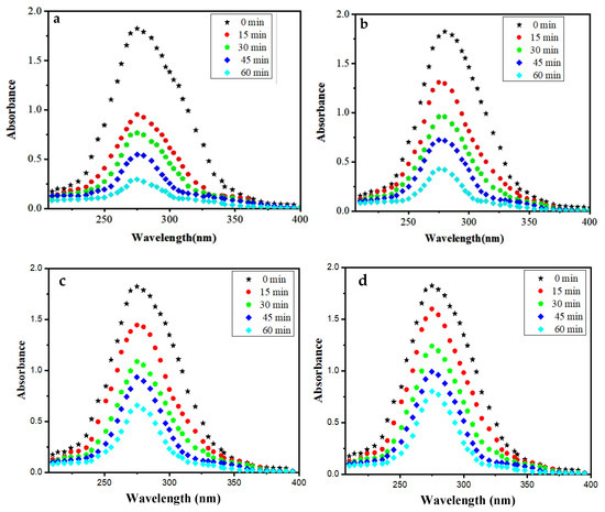 Absorption spectra of NOFX (15 mg/L) under optimal conditions (25 mL of SDB, pH 10, 60 min, 60 mgs QDs in the presence of (a) Mn:ZnS QDs in UV light; (b) Pure ZnS QDs in UV light (c) Mn:ZnS QDs in sunlight (d) Pure ZnS QDs in sunlight).