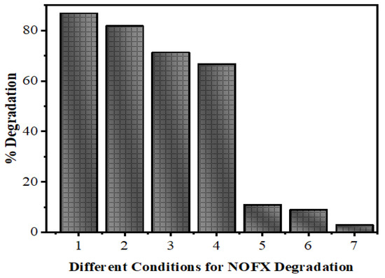 When the solution is acidic, NOFX and Mn:ZnS QDs are both managed by positive charge. The like charges show repulsive action, restricting the interaction of NOFX with the QDs surface, thus decreasing the rate of degradation. The attractive force between the deprotonated carboxyl moiety and the QDs forwards the degradation reaction [59]. Most competent and optimal NOFX degradation take place at the pH values lightly exceeding the pKa2, i.e., between 9.5–10.5. This may be attributable to a larger concentration of hydroxyl anions (OH−), which are the source of hydroxyl radicals during photocatalysis. The higher the OH− ion concentration, the larger will be the generation of hydroxyl radicals (OH•) [60]. Above this pH, degradation efficiency decreases, possibly due to the repulsion between negative charges of NOFX and ZnS QDs. Thus, pH 10 was selected as optimal pH value for further studies.