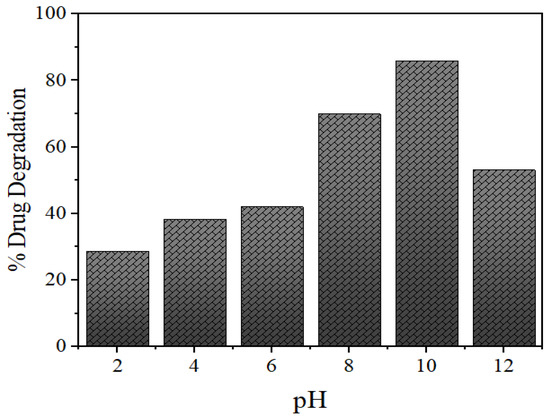 As expected, the photocatalytic degradation of NOFX occurred faster at basic pH, compared to lower values of pH (Figure 12), similar to earlier experiments with the same drug [56,57]. The photocatalytic degradation increased with pH increase, but maximal adsorption and degradation were obtained at pH 10.5–11. A higher value of pH lead to a lower level of adsorption and degradation of the drug. In fact, the surface charges of NOFX and Mn:ZnS catalyst are the main aspects behind this behaviour.