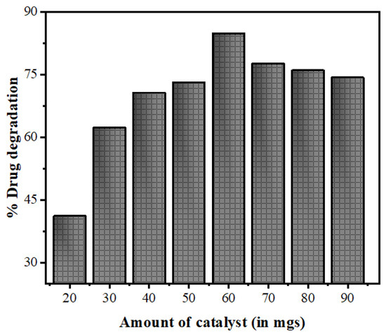 The nanophotocatalyst dose is an important parameter in the photocatalytic degradation of pollutants as the amount of the catalyst directly controls the transformation rate. In the present study, the reactions were done by varying the catalyst amounts (ranging from 20 to 90 mgs) while keeping the drug concentration fixed at 15 mg/L. The degradation of NOFX increased from 41% to 84% as the catalyst amount increased from 20 to 60 mgs/25 mL, and decreased to 79% on further increasing the catalyst loading for 1 h reaction. The initial increase in NOFX degradation may possibly be due to an augmentation in the active sites accessibility as catalyst loading increased. However, a further addition of catalysts reduced light penetration (owing to light scattering from suspension), thus the volume of photoactive suspension decreased. The results of Figure 13 illustrate that 60 mgs/25 mL catalyst is the optimal value for maximal drug degradation. As a result, further experiments were made with this amount of catalyst loading.
