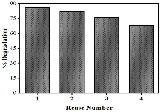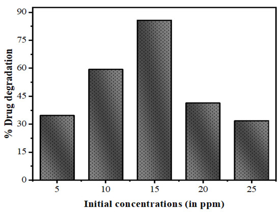 Treating the effluents present in the industrial and biological wastewater produced by natural and anthropogenic sources is a major challenge. Sometimes, industrial contaminants are chemically stable, and have inhibitory effects for biological treatment systems [61]. Thus, it becomes essential to develop methods for the removal of contaminants at high concentrations from the wastewater prior to releasing them into the environment. Therefore, in the present method, the photodegradation was investigated at different concentrations, including 5, 10, 15, 20, and 25 mg/L with a fixed quantity of photocatalysts, as shown in Figure 14. It can be observed that the degradation rate of drug decreases with the increasing drug concentration, showing elevated degradation efficiency for a low initial concentration.
