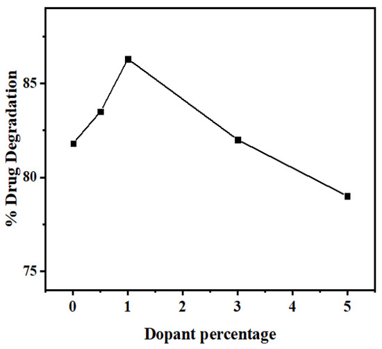 Nevertheless, a negative result in photocatalysis efficiency was observed for higher dopant concentrations. As seen in Figure 16, the photodegradation efficiencies of the QDs slightly increase from 0.0% to 1.0% and decline above 1% of the dopant concentration.