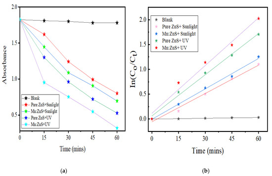 The NOFX degradation rates under sunlight and UV light were obtained from the plot slopes of Figure 17a,b. The R2 values show that the first-order model can be applied to the obtained experimental data. The values for the first-order kinetic data, together with rate constants (k), correlation coefficients (R2) and degradation efficiency for Mn:ZnS QDs for different conditions of photocatalysis are given in Table 2. The photocatalytic activity of synthesized pure ZnS and Mn:ZnS QDs under UV light and natural sunlight can be assessed by comparing the apparent rate constants. Thus, it can be seen that the photodegradation efficiencies of pure ZnS and Mn:ZnS QDs as catalysts under UV light illumination are higher than under natural sunlight irradiation.