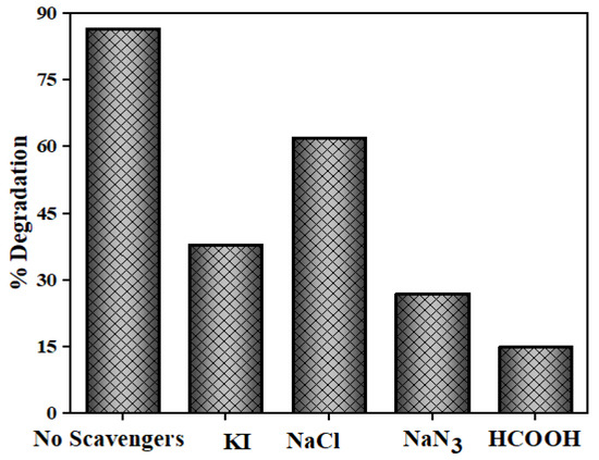 The reactive species capture study was also done in parallel to the photocatalysis experiments. This study was executed by addition of 0.01 M of various scavengers, for example, formic acid (HCOOH), potassium iodide (NaN3), sodium chloride (NaCl) and sodium azide (NaN3) before adding the photocatalyst into the NOFX solution. The percentage (%) of degradation was calculated from the following equation: