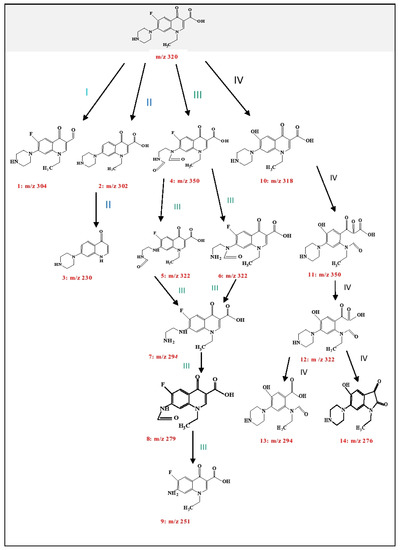 - Ahmad, I.; Bano, R.; Musharraf, S.G.; Sheraz, M.A.; Ahmed, S.; Tahir, H.; Arfeen, Q.; Bhatti, M.S.; Shad, Z.; Hussain, S.F. Photodegradation of Norfloxacin in aqueous and organic solvents: A kinetic study. J. Photochem. Photobiol. A 2015, 302, 1–10. [Google Scholar] [CrossRef]