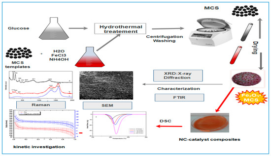 Nitrocellulose with nitrogen content of 12.56% was produced using the methodology mentioned in our recent works [2,41,42]. Different analytical chemicals comprising glucose (C6H12O6) for CMS preparation, iron chloride (FeCl3·6H2O), as iron precursor, and ammonia NH4OH as reducing agent for iron oxide synthesis, were provided by VWR chemicals (100 Matsonford Road, Radnor, PA, USA) and used without further purification. Absolute ethanol and distilled water have been used to purify the obtained catalyst.