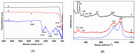 (A) Fourier transform infrared (FTIR) spectra of: (a) commercial hematite, (b) Fe2O3-CMS, (c) CMS, (B) Raman spectra of: (a) commercial hematite, (b) α-Fe2O3-CMS, (c) CMS.