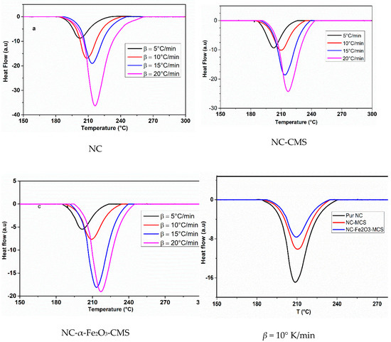 To evaluate different material combinations and ensure the safety during production and storage of energetic materials, compatibly is an important parameter that should be taken into account [65]. Among the various techniques used to evaluate compatibility, DSC thermal analysis is widely employed owing its outstanding features [6,7,42,66]. In order to investigate the compatibility and the effect of the prepared catalysts on the thermal decomposition of nitrocellulose, DSC analyses have been performed at different heating rate and the obtained thermograms are given in Figure 5. The three systems (Pure NC, NC-CMS, NC-Fe2O3-CMS) present the same trend, indeed, one exothermic peak is observed and corresponded to the decomposition of NC [67,68]. With the increase of the heating rate, the peak temperature shifts to higher values. Such results are in good agreement with other works [69]. According to the values of the onset and peak temperatures, given in Table 1, one can observe that the introduction of catalyst has slightly increased the peak temperature. Indeed, for β = 10 °C/min (Figure 5), pure NC decomposes 1.1 °C earlier than NC-CMS and 1.2 °C earlier than NC-Fe2O3-CMS. Considering the NC system with and without CMS/CMS-Fe2O3, the peak temperatures of DSC curves increase with the addition of CMS and CMS-Fe2O3, respectively. As the heating rate increases, the exothermic peak becomes sharper indicating a faster chemical reaction [70].