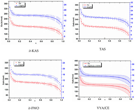 The error bars obtained for both Ea and log(A) are very close, indicating the accuracy of implemented computations [69]. The differences that appeared are undoubtedly caused by the different approximations used by the employed kinetic methods.