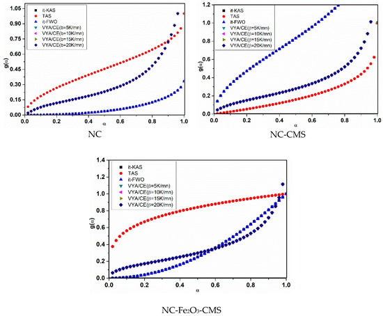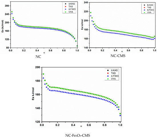 The accuracy of the obtained activation energy and the pre-exponential factor values for it-KAS, TAS and it-FWO is confirmed with the linear correlation coefficient (R2), which is found to be in the range (0.95626 to 0.99993). Furthermore, the obtained values of the activation energy and pre-exponential factor allowed us to check that the used isoconversional methods provided close values of Ea and A with a relative deviation of 15.85% and 23.35% for NC, 8.09% and 11.54% for NC-CMS and 7.88 and 11.60% for NC-Fe2O3-CMS, respectively.