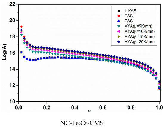 Moreover, Figure 8 and Figure 9, show respectively, the evolution of a Ea and log(A) against α using the four isoconversional methods for NC, NC-CMS and NC-Fe2O3-CMS. The results obtained show the same trends for Ea and log(A) evolution with a slight difference between models. Indeed, for the four employed isoconversional models, the values obtained seem to be close to each other with slight inferior values for it-FWO kinetic method. On the other hand, for the extent of conversion between 0 and 0.01, Ea and log(A) turn out to be more important what is attributed to the cleavage of O-NO2 linkages in nitrocellulose and the liberation of NO2 chemical groups. Then, the two parameters decrease until the end of the reaction. This behavior could be attributed to the autocatalytic parallel reactions, which can generate reactive species that may accelerate the thermolysis and hydrolysis processes [67,68]. As a very strong oxidizing agent, NO2 stagnates in the polymer skeleton and then reacts with the RO• radicals or their degradation products, causing the opening of the NC anhydroglucopyranose rings to generate other released gases [15,73]. Moreover, the values of Ea and log(A) obtained are within the range of 158.278–176.137 kJ/mol for Ea and 15.2281–17.2619 (s−1) for log(A) which correspond to the common rage values of energetic materials [14].