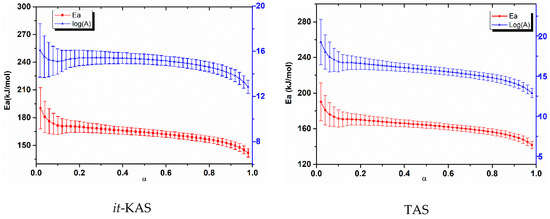 The error bars obtained for both Ea and log(A) are very close, indicating the accuracy of implemented computations [69]. The differences that appeared are undoubtedly caused by the different approximations used by the employed kinetic methods.