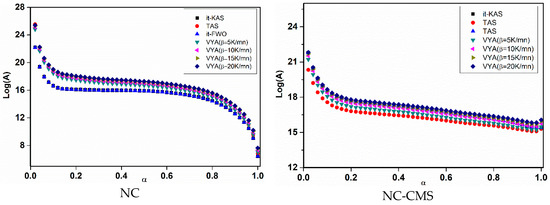 Moreover, Figure 8 and Figure 9, show respectively, the evolution of a Ea and log(A) against α using the four isoconversional methods for NC, NC-CMS and NC-Fe2O3-CMS. The results obtained show the same trends for Ea and log(A) evolution with a slight difference between models. Indeed, for the four employed isoconversional models, the values obtained seem to be close to each other with slight inferior values for it-FWO kinetic method. On the other hand, for the extent of conversion between 0 and 0.01, Ea and log(A) turn out to be more important what is attributed to the cleavage of O-NO2 linkages in nitrocellulose and the liberation of NO2 chemical groups. Then, the two parameters decrease until the end of the reaction. This behavior could be attributed to the autocatalytic parallel reactions, which can generate reactive species that may accelerate the thermolysis and hydrolysis processes [67,68]. As a very strong oxidizing agent, NO2 stagnates in the polymer skeleton and then reacts with the RO• radicals or their degradation products, causing the opening of the NC anhydroglucopyranose rings to generate other released gases [15,73]. Moreover, the values of Ea and log(A) obtained are within the range of 158.278–176.137 kJ/mol for Ea and 15.2281–17.2619 (s−1) for log(A) which correspond to the common rage values of energetic materials [14].