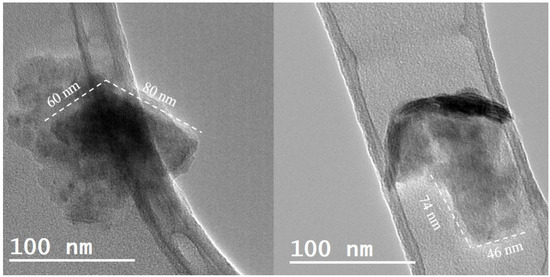 TEM analysis was performed to study the size and morphology of the nanostructures obtained by the LPE process. The WS2 nanostructures found in all the nanofluids were nanosheets with lateral dimensions between 45–80 nm, as seen in Figure 1. The high dispersion and electrotransparency of the nanosheets are evidence of a successful exfoliation process.