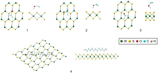 The success of the exfoliation process can be understood from the analysis of the interaction between WS2 nanosheets, the surfactant and the molecules of the fluid, studied from periodic-DFT calculations. Thus, the interaction sites of the PEG with the WS2 nanosheet were studied based on their interaction energies. The interaction sites are shown in Figure 2. For the interaction with the surface, four binding sites were selected. For the selection of such sites it was defined as the reference point the H of the H–O group of the PEG over a W, the S atoms and over the gap between three S and W, structures 1, 2 and 3 in Figure 2, respectively. The interaction in parallel with the H atoms over the surface of the WS2 nanosheet was also analyzed (4 in Figure 2). For clarity purposes, only the terminal region of the surfactant molecule that interacts with the surface of the WS2 has been shown in Figure 2 for the images of structures 1–3.